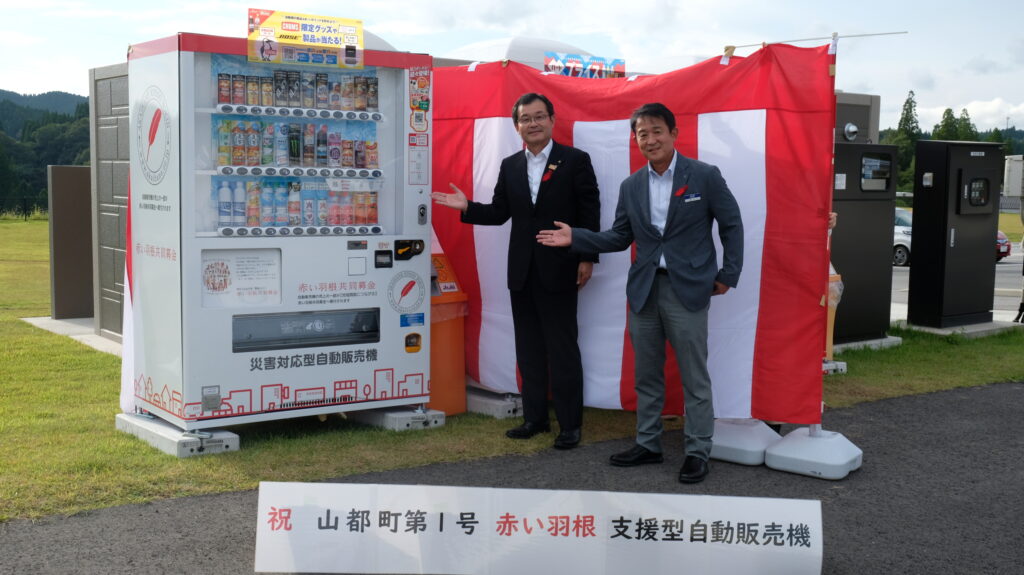 9月18日山都町運動公園に町内第一号となる「赤い羽根支援型自動自販機」が設置されました。飲み物購入金額の一部が赤い羽根共同募金として、寄付され、地域の社会福祉活動に活用されます。