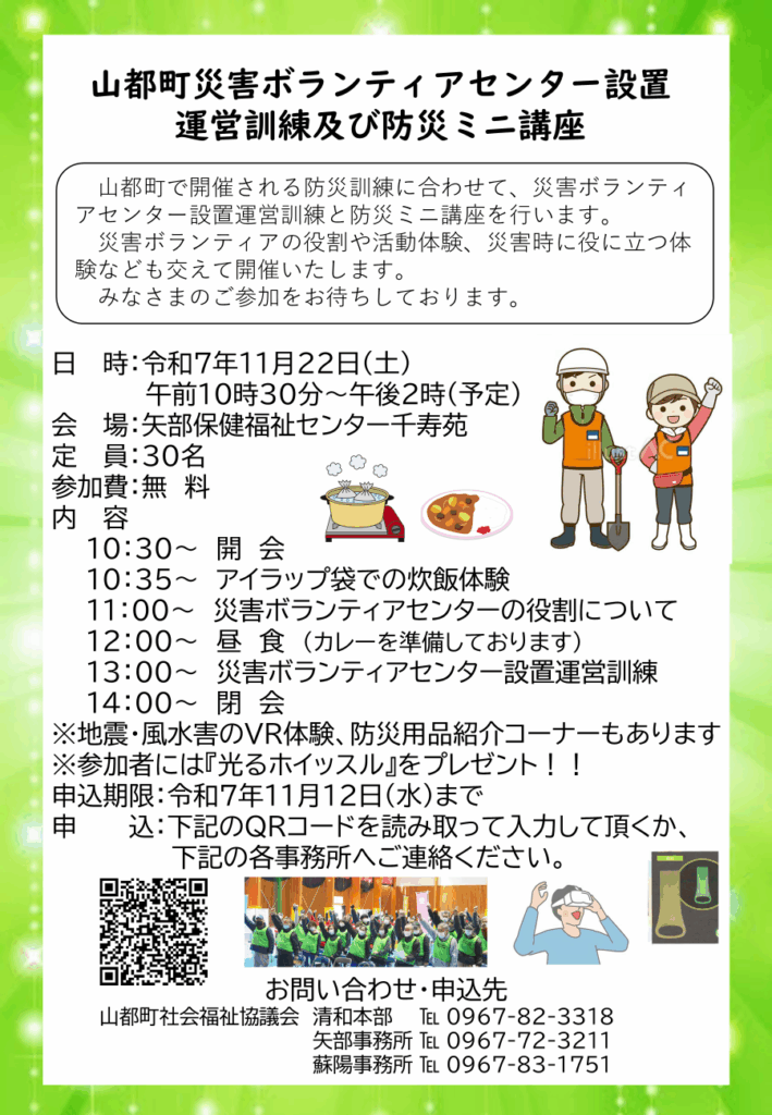 令和7年度11月22日(土)災害ボランティアセンター設置運営訓練と防災ミニ講座を行います。