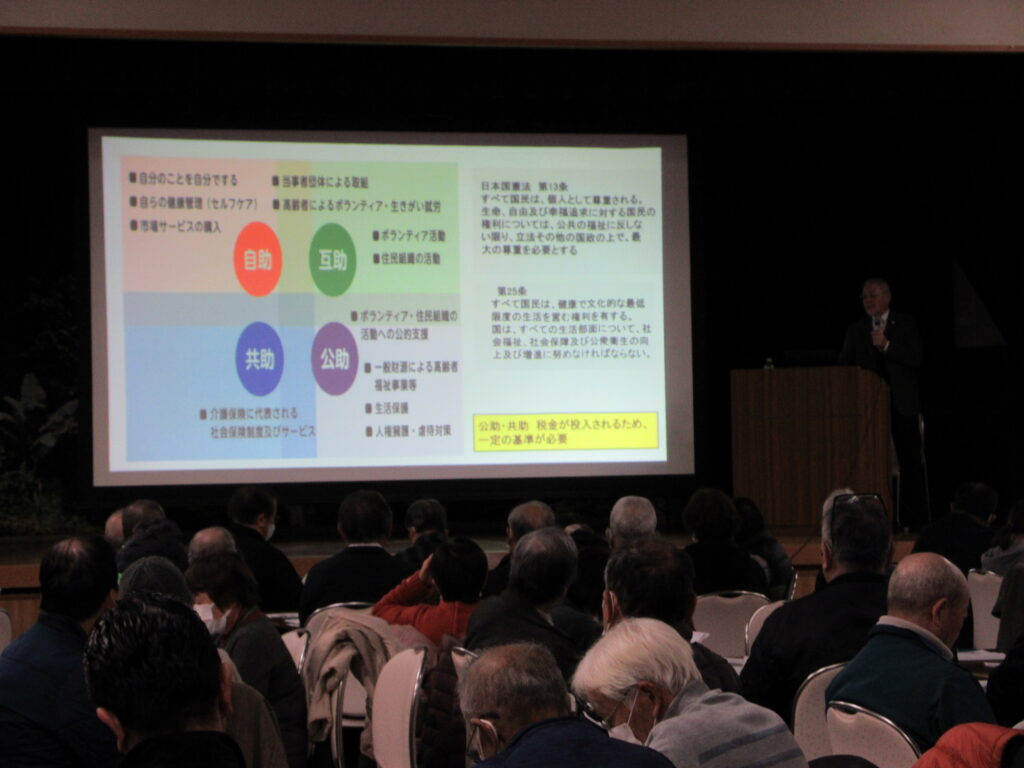 2月10日に山都町重層的支援体制整備事業移行準備事業 講演会を開催しました。講師に熊本学園大学の今吉光弘氏をお招きし、「地域のつながり向上研修~みんなでつくる 向こう三軒両隣 しあわせ笑顔の山都町~」と題し、地域共生社会の概要や地域で暮らす皆さんの役割などについてお話しいただきました。当日は自治振興区会長や30地区福祉会長、民生委員児童委員のほかに行政、町議会議員、医療・福祉関係機関など、地域を支える様々な立場の皆様にご参加いただきました。地域ごとのグループワークでは「回覧板はなるべくポストに入れず手渡しするようにしたい」「コロナ禍以前に行われていたイベントを復活させたい」など、各地域さまざまな意見が出され、活発な意見交換が行われました。